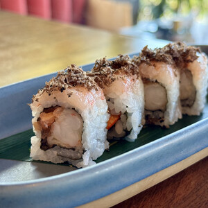 Uramaki di avocado , mazzancolle in panko , salmone scottato con maio spicy , salsa agrodolce , cipolla fritta e ikura