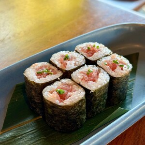 Uramaki di avocado, gambero impanato nel panko, tartara di tonno, salsa in agrodolce, cipollina fritta.